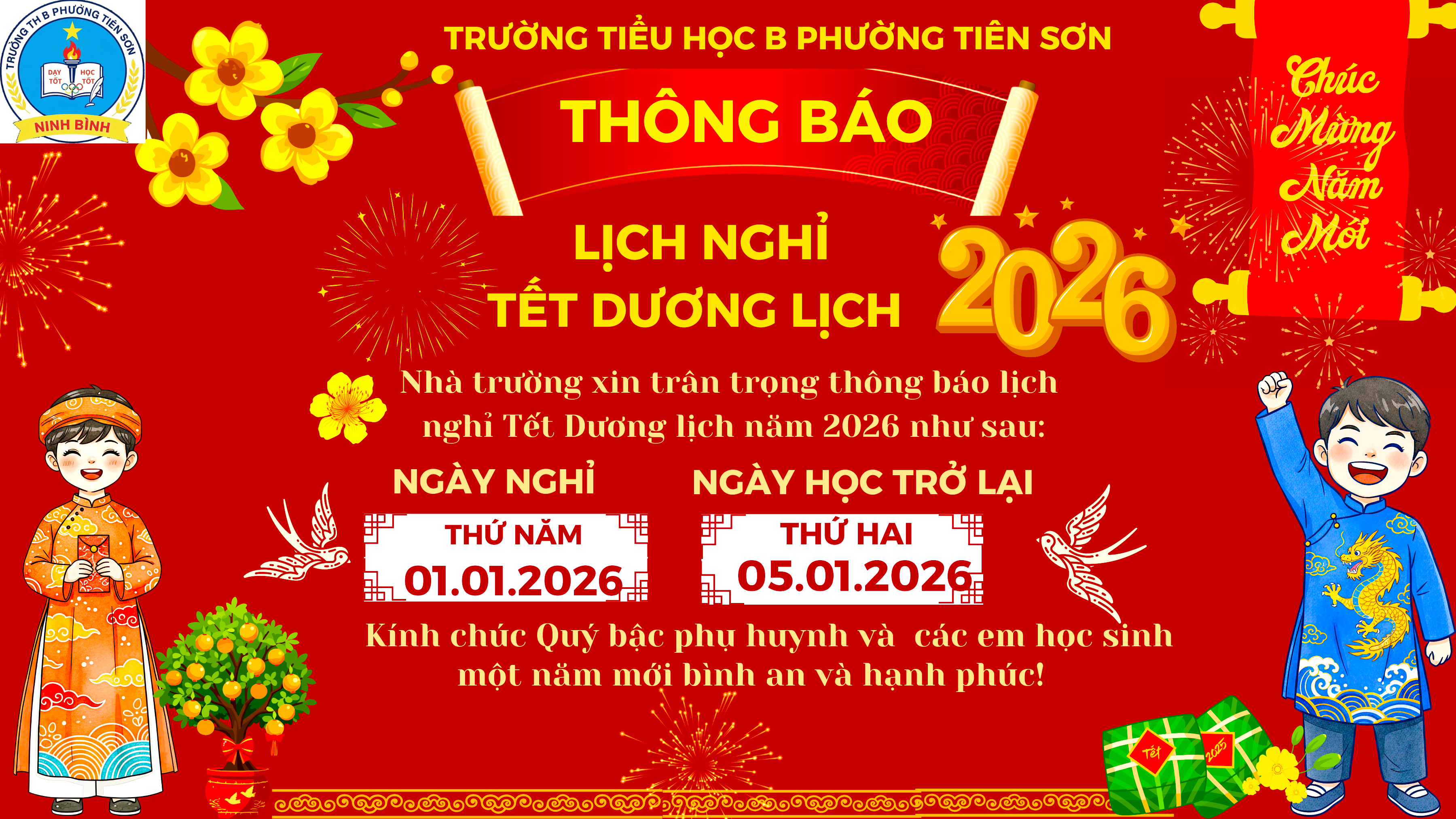 Trường Tiểu học B phường Tiên Sơn trân trọng thông báo tới toàn thể Quý Phụ huynh và các em học sinh lịch nghỉ Tết Dương lịch 2026 như sau: